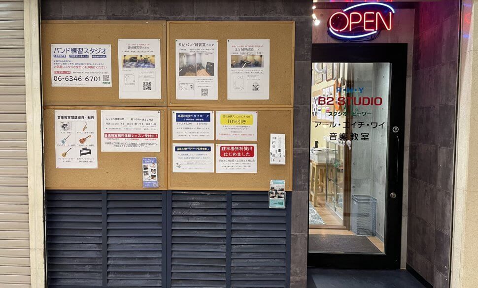 大阪の第三ビル2階にある音楽スタジオですので、いわゆる大阪のど真ん中にあります。ビジネスオフィスなどが立ち並ぶ場所でお仕事終わりフラッと寄れ、最高の音色でレッスン出来る嬉しいスタジオです。